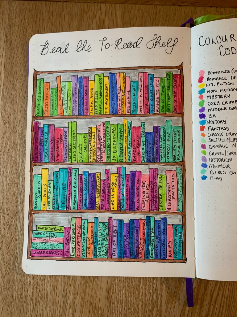 Bonus picture: Here’s my completed Beat the To Read Shelf spread from my journal. I started this in 2018 as a way of making me work my way through the books on the tbr pile. I find that I hate not finishing something even more than I hate being “forced” to read something. But the library ebooks meant I fell a little bit behind this year – and had to do almost an entire shelf in the last month and a half of the year, and half a shelf in the last ten days. I’m dead proud of it now I’m done though!