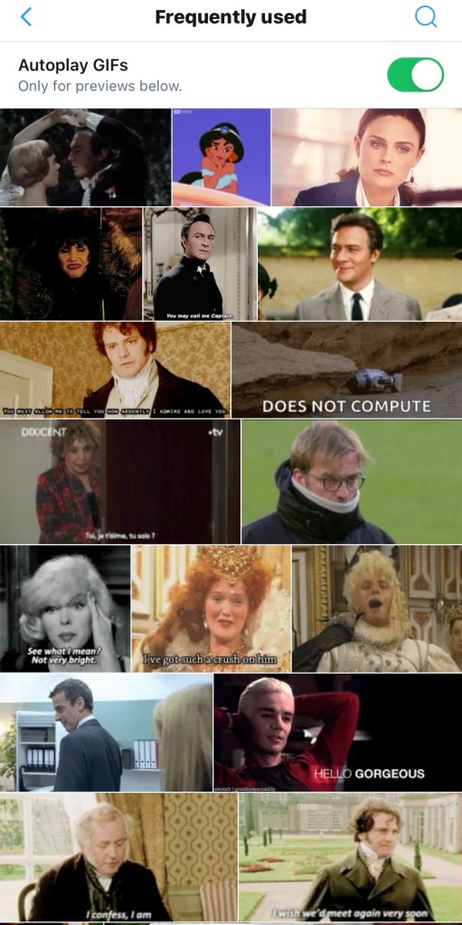 Bonus photo: After the death of Christopher Plummer on Friday, I went on a bit of a Captain von Trapp gif fest on Twitter, and happened to see my Frequently used gif list, which I thought was actually a pretty good summary of my currently life and interest, so I post it here for your amusement.
