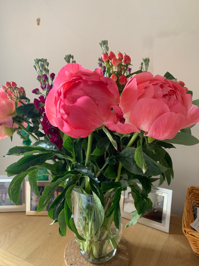 Bonus photo: I do love peonies. The plant in the garden only ever produces about two flowers, but luckily, my monthly bouquet of flowers included them this month, and aren’t they beautiful?