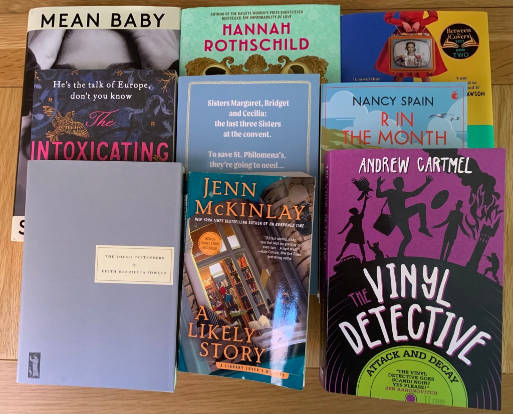Another bumper crop – because not only did a bunch of preorders arrive since last month’s post, but there that charity book sale at work the other week and we know that I can’t resist a book sale. So the Hannah Rothschild, Intoxicating Mr Lavelle and Small Miracles (dead centre) are from the booksale. Mean Bab and Attack and Decay were pre-orders of new releases and the Nancy Spain was a preorder of the new edition. Top right is Bonnie Garmus’s Lessons In Chemistry which I just keep hearing about and The Young Pretenders is the lastest of my Persephone a month subscriptions (which already bought me Miss Buncle Three and A House in the Country). The Jenn McKinlay? Well that was a total impulse purchase after I was doing some rearranging on the back bookcase and realised that I was way behind with the series…