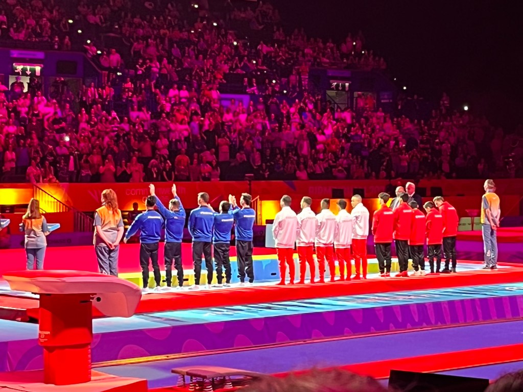 As I said, England won the gold – but Cyprus won the bronze after missing out four years ago and were totally delighted about it – including their top scorer (and second highest in the all around qualification) Marios Georgiou who appeared to hurt his hand (dislocated a finger or thumb we thought) in his dismount from his final apparatus the pommel horse. Team Cyprus’s celebrations were epic – and fingers crossed Mario is ok for the final.