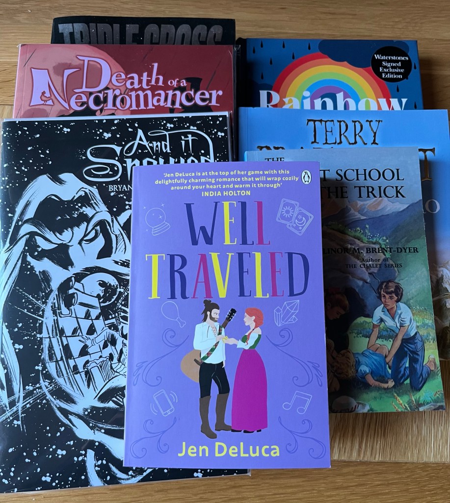 A smaller selection this month – and you’ve already seen two of them – Last Hero was a BotW already, and the Rainbow Rowell was a book I bought myself for Christmas! Then there’s a proof copy of Triple Cross that just appeared, my copy of Death of a Necromancer that I contributed to the Kickstarter for (and my bonus content!), the latest – and one of the last Girls Gone By Chalet School Books before my collection is complete and the new Jen DeLuca. Nice.