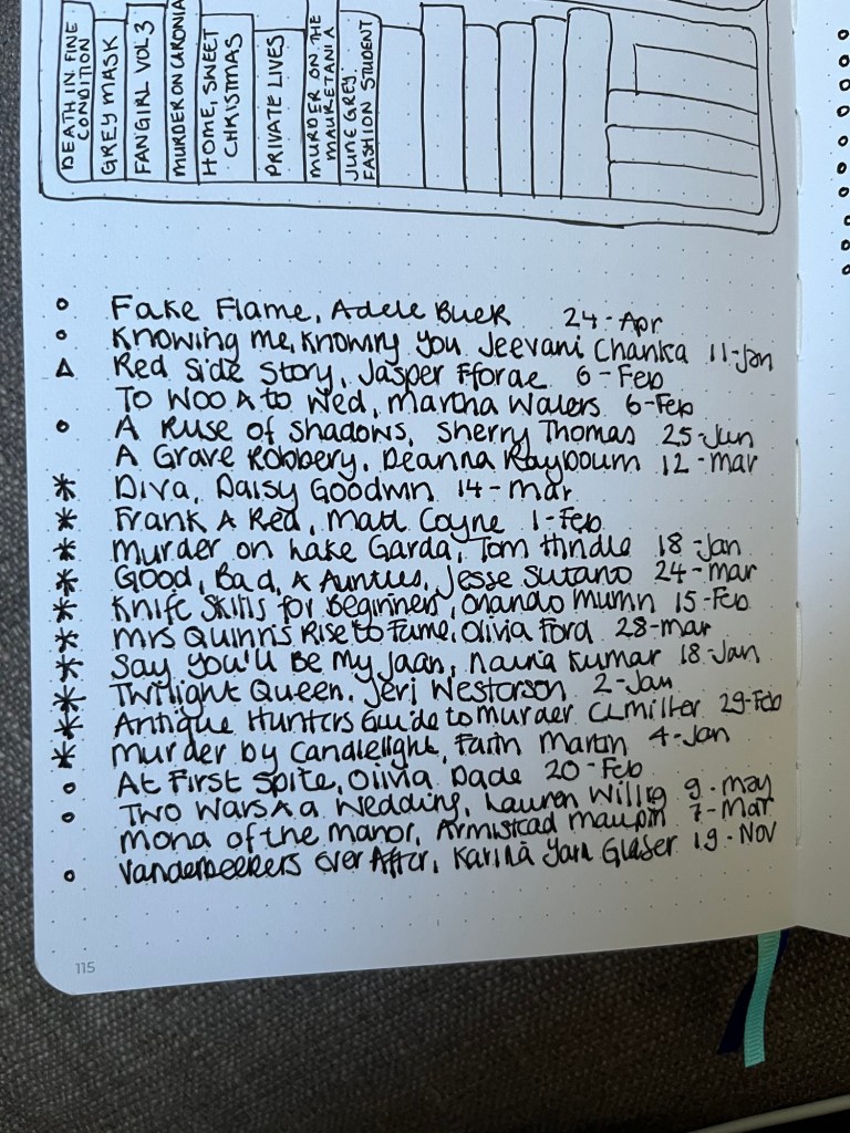 It’s that time of year again – where I look ahead to the books I can’t wait to read in 2024 – which also could be know as “What Verity has got on Pre-Order”. And not gonna lie, I’ve got form for some of these ending up on my end of year lists as well. I’m trying not to do too many “Latest in x series” books, because if you’re not already reading the series you shouldn’t start with them, but also I’ll probably remind you about them later too. I am going to shamelessly break that a few times in this post too. Because of course I am. OK, enough of the rules that aren’t really rules and on to the books. Today’s picture is the list as it stood in my last journal at the end of last year – hence the mini-bookcase above for the overflow from the big Beat the to Read Pile bookcase.