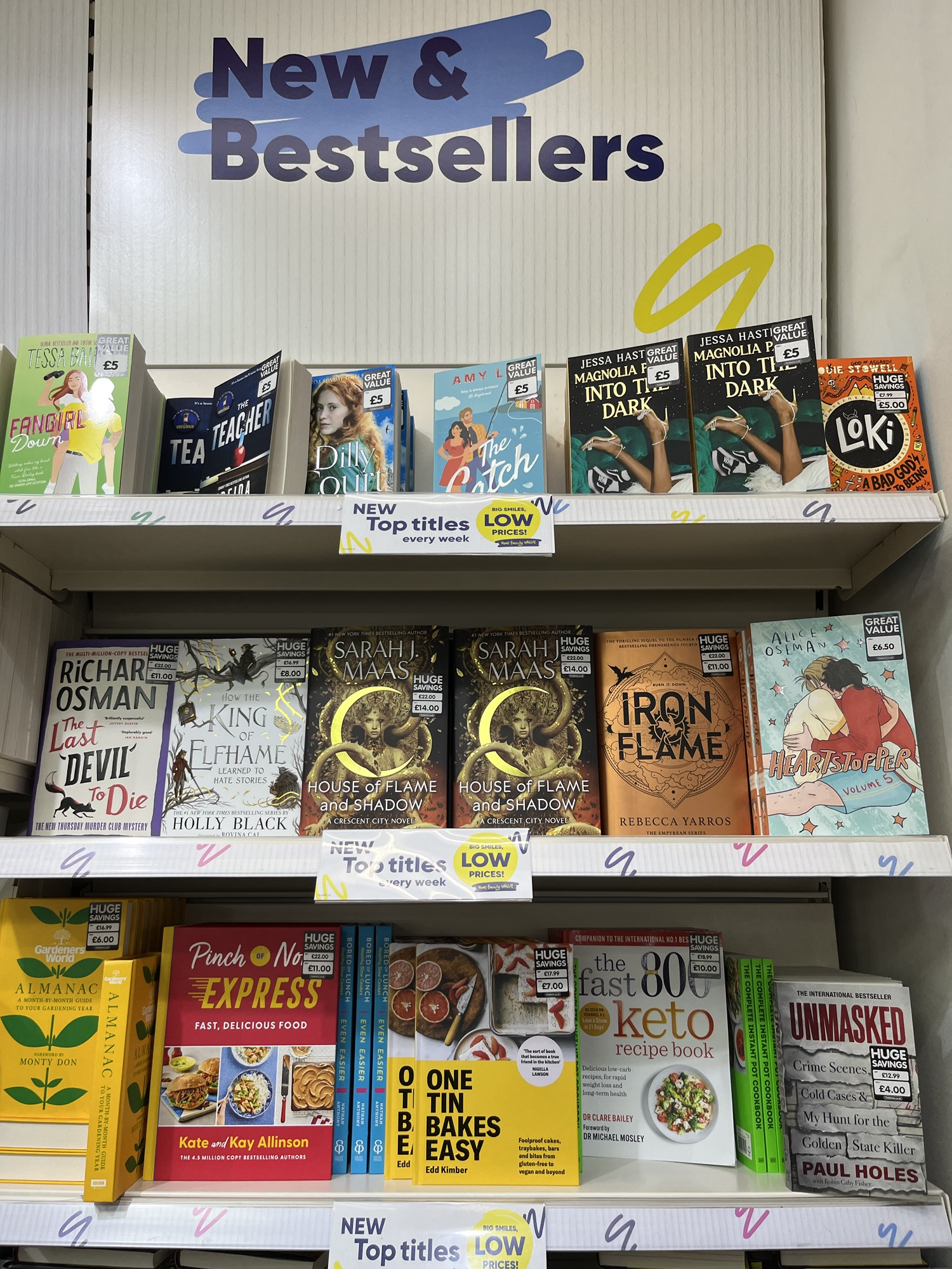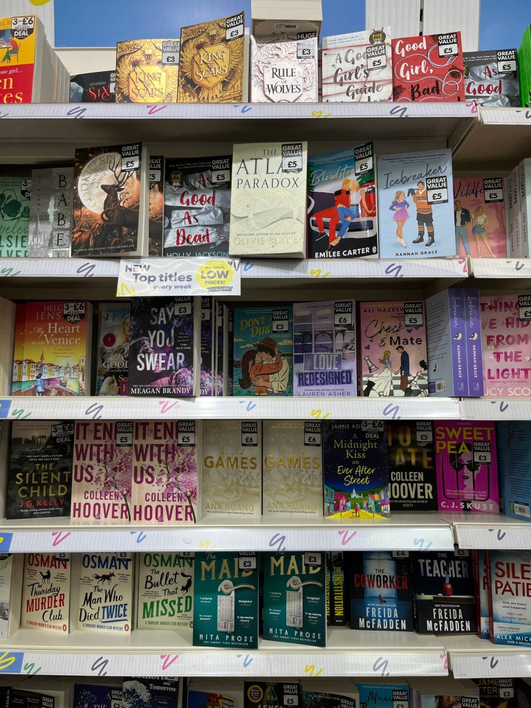 So admittedly the Rebecca Yaros and the Richard Osman came out in the autumn and Heartstopper 5 just before Christmas, but House of Flame and Shadow only came out a couple of weeks ago – I know because Gower Street had that event for it. But there are three brand new books here – the Amy Lea, the Tessa Bailey and the Jessa Hastings all only came out *this week* and it’s already on the shelves. Yes there are some old books here too, but this is much newer than The Works used to stock.
