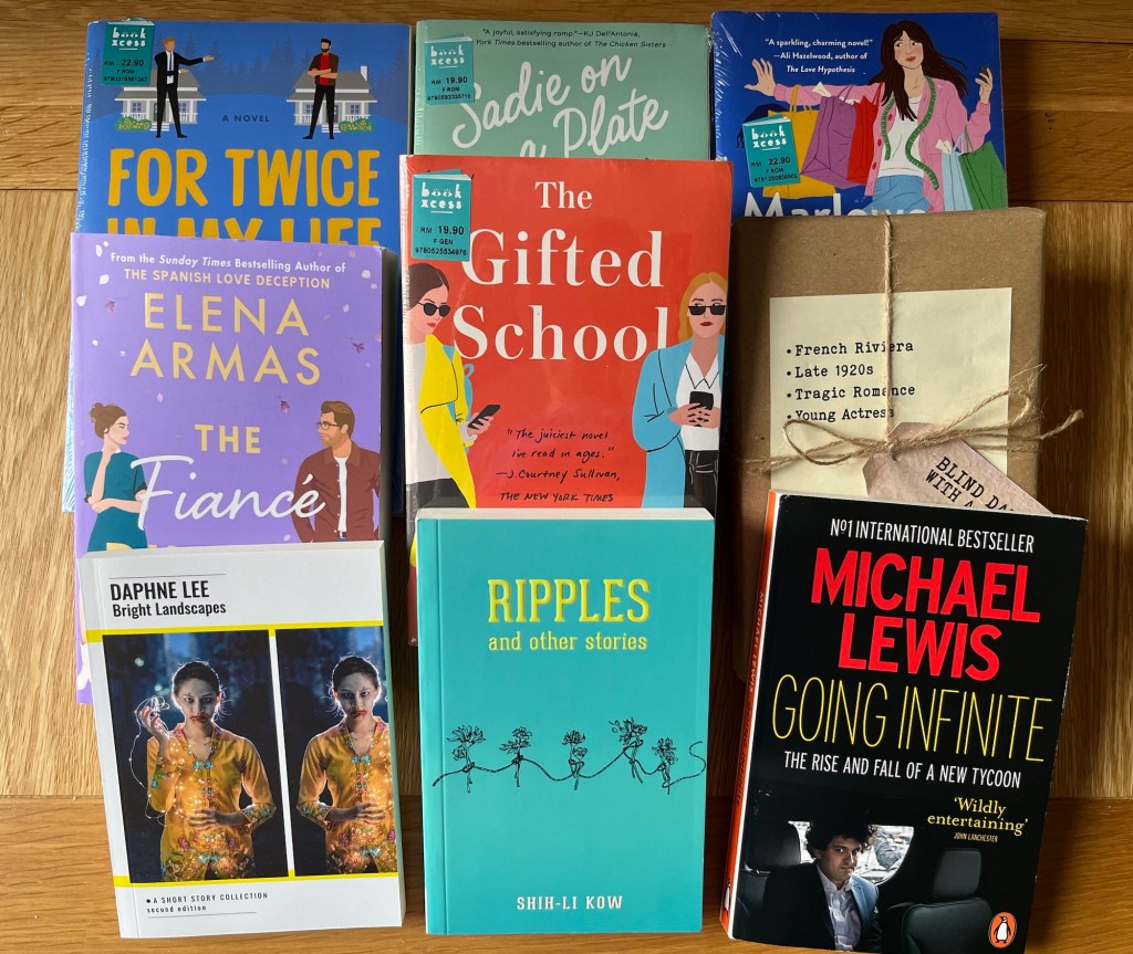 Lets start with the airport purchases. The autumn releases haven’t really kicked in yet, so the selection in W H Smiths was a little disappointing, but I still managed to find two I wanted. I’d nearly finished Going Infinite by the time I got to Kuala Lumpur – and I’ve already written about it – and the Elena Armas was the other half of the buy one get one half price. Then the five from the bookshop are the three on the back row and the other half of the middle row. I’m hoping at least one of them is a Rich People Problems book, but the shrink wrap means it’s a bit of a lottery, but all the blurbs were good – and Marlowe Banks… is one I’ve had my eye on for a while, but which hadn’t come my way at a price I was willing to pay before. At the front we have a book of short stories that was given to me by the author, who is a friend of a friend and was kind enough to show me around while I was visiting, and she also gave me Ripples. So thank you Daphne – I had a fabulous time with you and I’m looking forward to reading the books. Oh and if you were wondering what the blind date with a book turned out to be, here’s the answer: