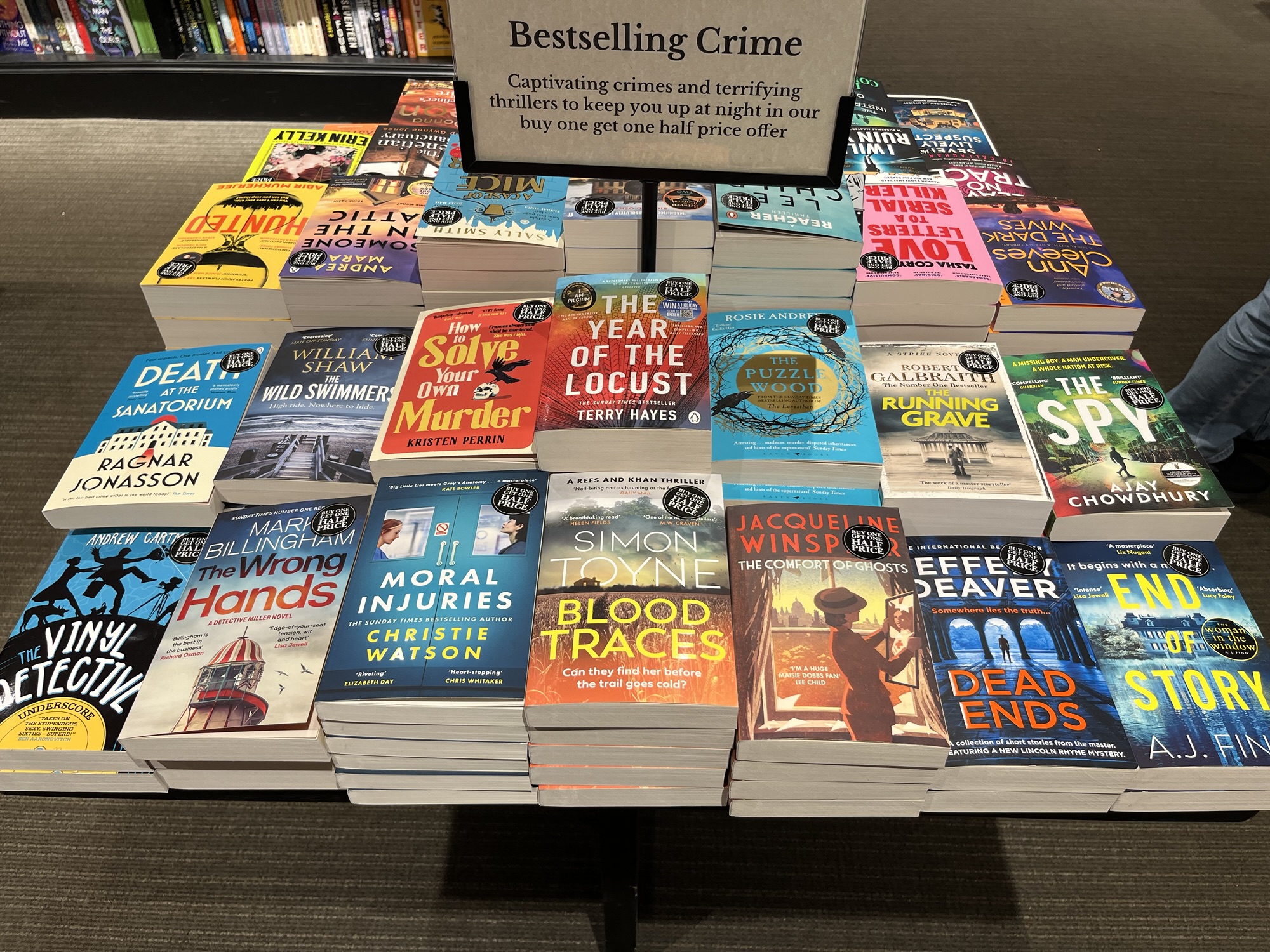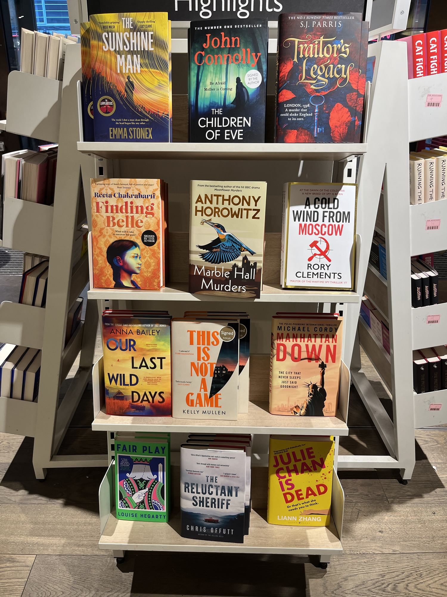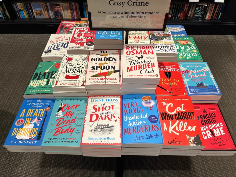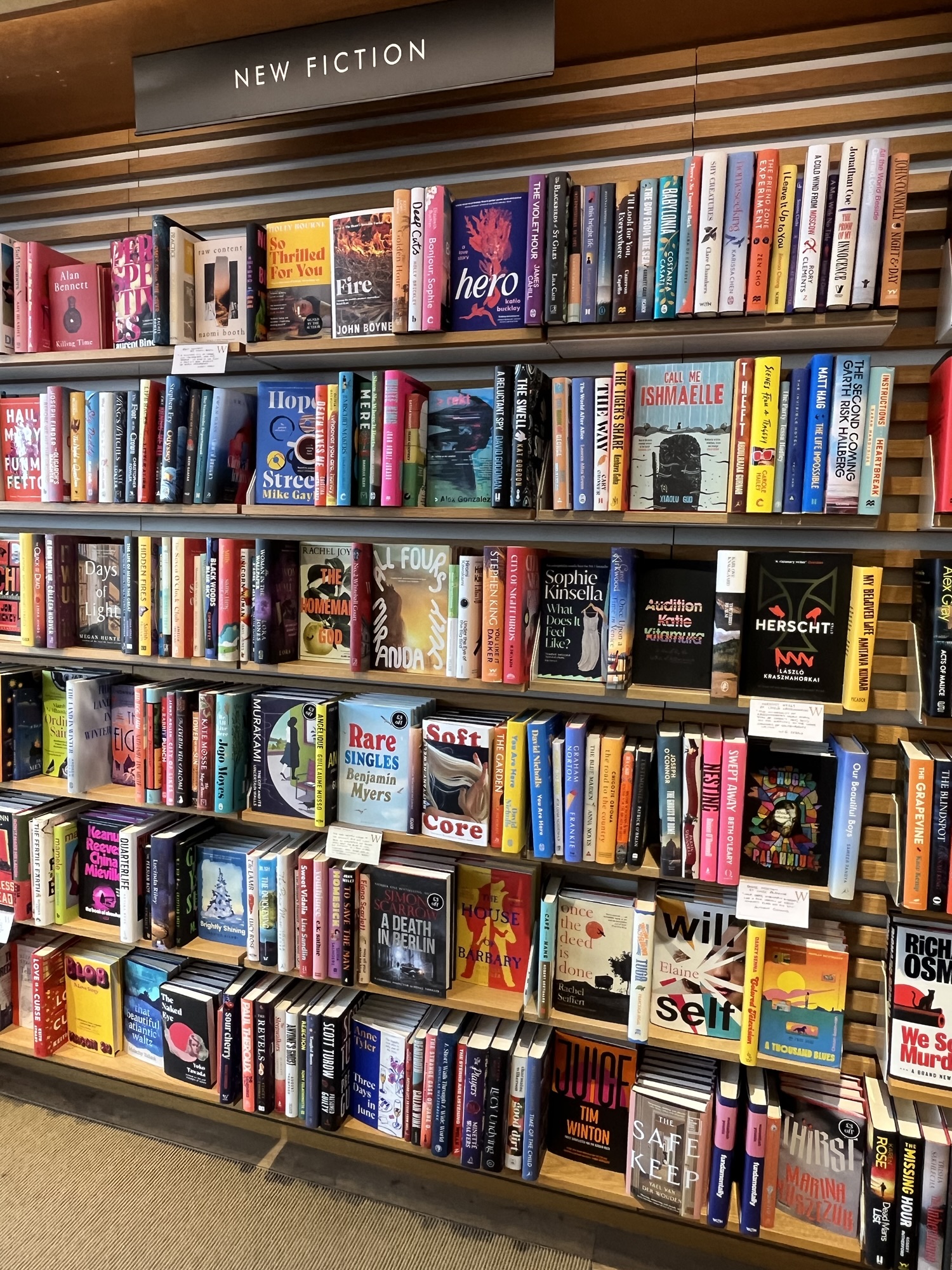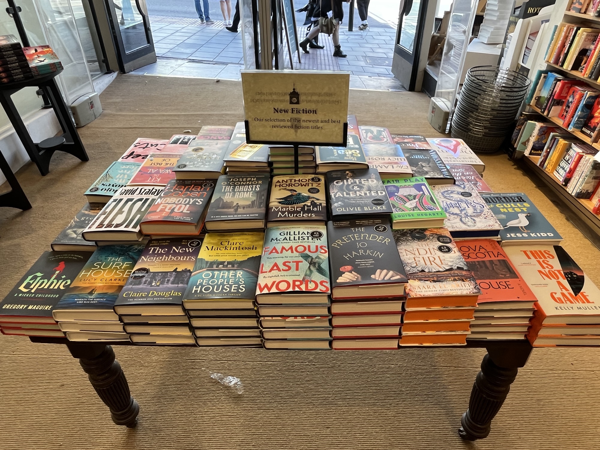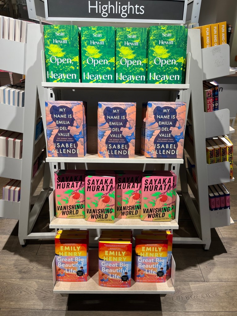 This selection of hardback fiction was facing the entrance – I really want to read the Emily Henry but I’m restraining myself because I’m fairly convinced there will be an airport paperback version of this that I can buy next time I fly somewhere, if there isn’t a deal on the ebook first. Open Heaven is described as “heartrending” and I think we know I’m not in the market for that, the Isabel Allende sounds interesting, but I still have at least one of hers on the Kindle waiting to be read but the Sayaka Murata sounds interesting – about a world where most babies are conceived by artificial insemination and marriages are sexless – but also I’m still not in the market for dystopian future stories!