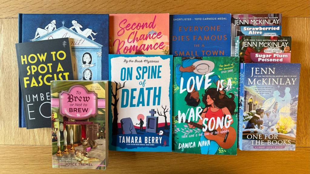 As you know, a couple of these are already off the pile – I read Second Chance Romance last week pretty much as soon as it arrived, although I paced myself while reading it to try and make it last. Strawberried Alive from Jenn McKinlay’s Cupcake Bakery series is this year’s Arizona book for the Fifty States Challenge, and Sugar Plum Poisoned will be next years – as will One for the Books from her Library Lovers series for Connecticut. Actually there are quite a lot here that could end up being on the 50 states list next year – To Brew or Not to Brew is the first in a cozy mystery series set in Pennsylvania that I picked up in Waterstones Picadilly when I was checking out their Legami popup, Everyone Dies Famous in a Small Town is a short story collection set in Alaska and the American West, Love is a War Song is a romantic comedy with a pop star and a cowboy set in Oklahoma and On Spine of Death is the sequel to last week’s Book of the Week Buried in a Good Book and set in Washington. That just leaves the non-states books and Do Admit is a graphic novel about the Mitford sisters while How to Spot a Fascist was a purchase in Riverside Books.