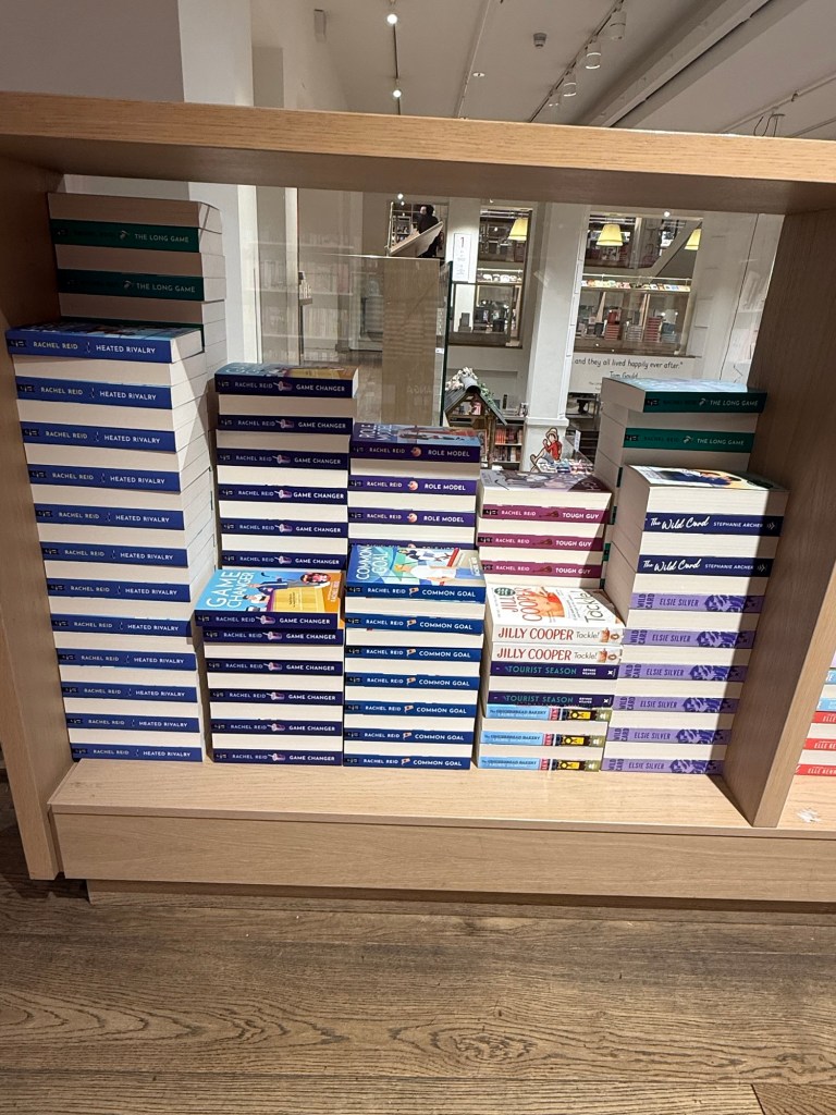 This is Foyles Charing Cross Road, and the first thing to note her is that Heated Rivalry is right there. The series based on the books has had loads of buzz and now the novels are available here in paperback. They were also in the window at Waterstones just up the street on Tottenham Court Road, but Foyles is clearly ready for the demand because they had them on the shelves and piles of them in the over flow section at the back of the romance section.