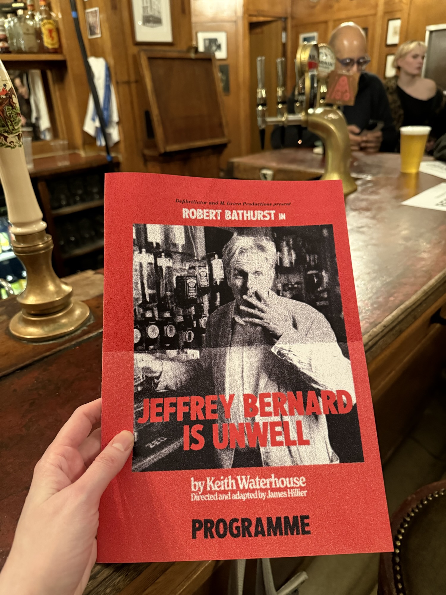 And the second show today is Jeffery Bernard is Unwell which had a run at the Coach and Horses on Sunday and Monday nights in March. Jeffery Bernard was a real life journalist and this play was written and originally staged in the 1980s when Bernard was still alive. Bernard wrote the “Low Life” column in The Spectator, and the title refers to the one line apology the paper would print on the column’s page when he was too drunk (or too hungover) to produce his copy and it was too late to find anything else to fill the gap! The play started as a star vehicle for Peter O’Toole with a supporting cast but was adapted into a one man show in 2019 to be performed at the Coach and Horses pub in Soho – which was Bernard’s regular drinking venue – by Robert Bathurst. This is the at least the third time that it has been brought back – to the same venue with the same star. It won a bunch of acclaim and awards and sold very, very well, so when I saw it pop back up I forked out full price (unusual for me!) for a seated ticket (as opposed to the cheaper standing option) to see it and found myself right opposite Bathurst’s main perforamce spot in the venue which was a delightful treat. It’s only an hour but it’s a hell of a performance feat – one man and a pub full of people and no where to hide if it goes wrong, which considering the climax includes a trick involving a glass of water, a matchbox and an egg is quite something. It was a late start (and so a late night on a work night) but it was totally worth it.